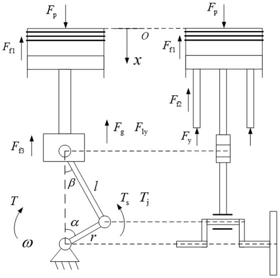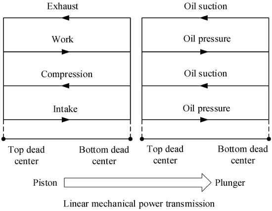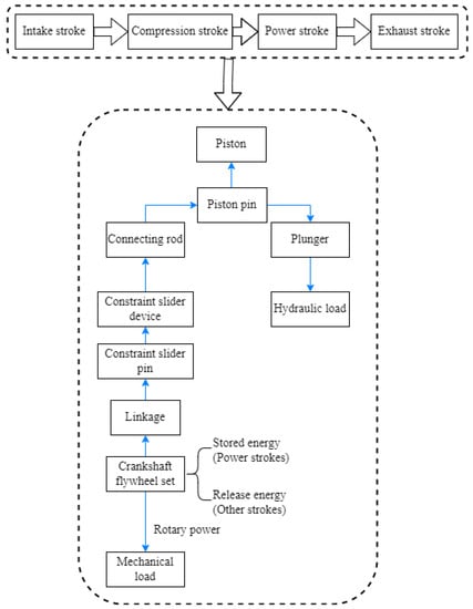 Figure 3. Taking one working cycle of the engine as an example, during the power stroke, the expanding pressure generated by the combustion of fuel in the engine cylinder acts on the surface of the piston, driving its movement. Using the piston pin as the power distribution point, one portion of the power is directly used to drive the plunger to generate the hydraulic energy for oil pressure, while the other portion of the power drives the constrained slider through the linkage to perform the linear motion. Subsequently, through the connecting rod, the power is transmitted to the crankshaft and flywheel, converting the power into a rotational force. At this time, part of the energy from the power stroke is absorbed by the flywheel to maintain the stability of the crankshaft speed. During the other strokes, the energy absorbed by the flywheel is released, and the power is transmitted to the piston pin through the crank-connecting rod structure. One portion of the power drives the plunger to continue the oil suction and pressure work, while the other portion of the power drives the piston to create the conditions for the next power stroke.