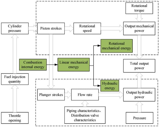 The hydraulic engine integrates the reciprocating plunger pump system into the engine. After the internal energy of fuel is converted into the linear mechanical energy of the piston, it is divided and converted into the hydraulic energy and rotational mechanical energy for output. The thermal–mechanical–hydraulic power flow coupling and conversion process is shown in