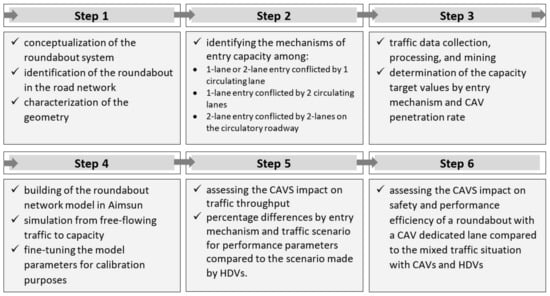 This section presents the microsimulation-based methodological framework designed for evaluating road infrastructure safety and performance efficiency with CAVs in traffic. With a view to assessing whether cooperative driving is compatible with roundabout navigation, the structure of the stepwise approach included subsequent steps for identifying a roundabout case study and the mechanisms of entry capacity, collecting traffic data and developing the CAV-based capacity curves, simulating traffic scenarios from free-flowing traffic to capacity for calibration purposes, and assessing the CAV impact on traffic performances. On the basis of the above steps, the safety and performance efficiency of a roundabout with a CAV dedicated lane has been evaluated compared to the mixed traffic situation with HDVs and CAVs in traffic. Figure 1 shows an overview of the proposed procedure applied to roundabouts.
