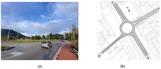 The roundabout case study: (a) the south entry view (latitude 38.177443 and longitude 13.309095 in decimal degrees); (b) the roundabout network model built in Aimsun and visualization of the centroids used as the origin and destination of the trips in the case study.