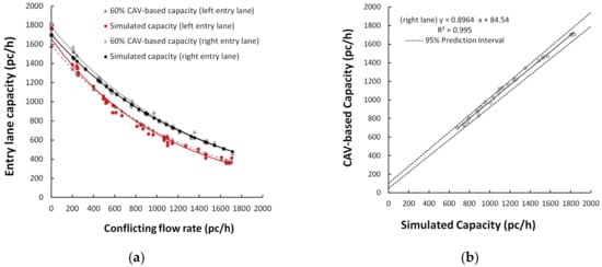 The roundabout model built in Aimsun: (a) the comparisons between the CAV-based and simulated capacities for the scenario with 60% CAVs and 40% HVDs; (b) scattergram analysis for the mixed traffic with 60% CAVs and 40% HDVs (right lane).