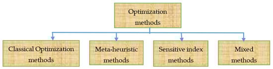 FACTS optimization problem-solving methods can be classified into four main groups that are widely used in the literature, as shown in Figure 1: classical optimization techniques, metaheuristic methods, sensitive index methods, and mixed techniques.