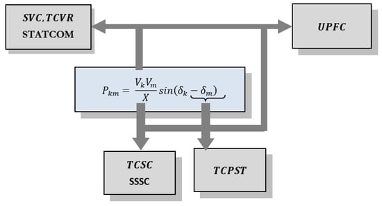The installation of the optimal FACTS devices in the transmission network allows the system to work very near to its stability and thermal limits. The AC power system has inherent power stability as the power flow between the lines is dependent on the receiving and the sending end voltages. For a lossless line, which has the sending end voltage Vk and receiving end voltage Vm, δk and δm are the phase angles of the sending and receiving end, respectively, where X is the reactance of the line. Each type of FACTS controller will be used according to well-defined control objectives. Figure 2 below presents the possible actions for controlling the transited active power in a transmission line.