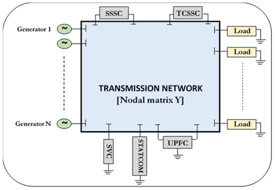 Depending on the type of FACTS and its position in the line, only part of the coefficients of the matrix may have modifications. A symbolic representation of an electrical power network is shown in Figure 4, containing several loads, several generators, and some main FACTS devices. The different constituents are interconnected through the transmission network modeled by its nodal matrix . The latter does not contain the admittances of the devices and the loads; it only presents the admittances of the transmission network [68,69,70,71,72,73]. The SVC, TCSC, STATCOM, SSSC, and UPFC are the most thoroughly studied devices in most of the research in the literature.