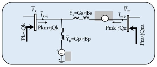 The FACTS are considered elements that directly modify the nodal admittance matrix of the network [67]. They are inserted into the line as shown in Figure 3. Depending on the type of FACTS modeled, the device can be placed in the middle or at one end of the line.