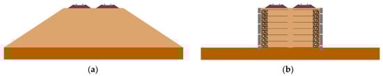 These structures provide cost-effective solutions because they require less ground stabilisation/improvement as well as land acquisition than conventional embankments due to their reduced base area requirements (Figure 1) []. In addition, they offer lower residual displacements during operation, resulting in superior operational performance compared to conventional embankments. Numerous field investigations have been conducted to develop design methodologies for the materials and construction steps required to build GRS-RW structures for high-speed railways [,,,,,,,,,]. Overall, the retaining walls, backfill, and geosynthetics wrapped around gravel bags located directly behind the retaining walls provide structural stability. Additionally, reinforced-soil barriers tend to be more flexible than conventional retaining structures. Therefore, they can be utilised in regions where large, irregular displacements are anticipated as a result of surface movements during earthquakes.