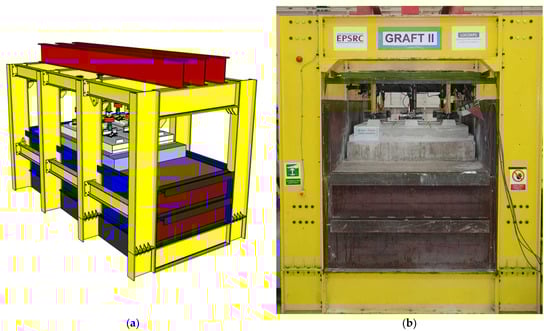 The GRS-RW system was investigated in the GRAFT-II facility by Esen, et al. [] following the same testing procedure used for a conventional embankment []. The substructure was made of a well-compacted base layer topped with a 1.2 m high geogrid-reinforced fill. The Tensar RE540 geogrid was used, known for its enhanced long-term tensile strength. During construction, the geogrid is placed over the base layer, and gravel bags are placed at the track ends in a brick wall pattern. The geogrid is then pulled and tightened over the bags, providing tensile strength. Pre-stressing and subsequent layers are added to reach a total height of 1.2 m. Steel tie bars are placed between the layers and connected to steel plates after the structure is formed. Self-compacting concrete fills the gap between the steel plate and the gravel bags to form a fully connected retaining wall system.