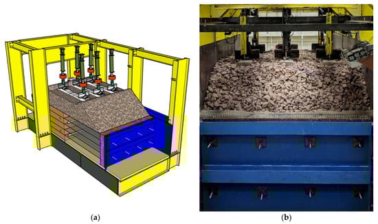 Slab track resting on the conventional embankment in the Geopavement and Railways Accelerated Testing Facility (GRAFT-II). (a) A 3D sketch of the facility and (b) a photo of the facility from the side view.