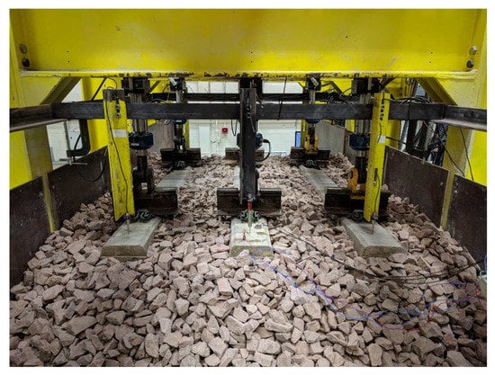 The availability, maintainability, and cost of ballast make it an ideal geomaterial for railways []. The main functions of ballast, as stated previously [,,,,,] are to bear the vertical, horizontal, and longitudinal forces and to limit the movements of the particles. It helps to distribute the loads applied by trains over the subgrade and protect the subgrade from high stresses, thus, lowering permanent deformations. It also provides resiliency, absorbs vibration energy, and reduces noise. The ballast also facilitates drainage to keep water away from the track, allows maintenance, inhibits the growth of vegetation, and reduces frost problems. Despite these very important functions, as well as being cheap and practical, slab track structures are becoming increasingly used in high-speed railways to overcome the need for continuous maintenance, among other reasons. In addition to the ongoing discussion on the performance of the ballasted and ballastless (slab) tracks, alternative types of track support structures such as geosynthetically reinforced soil are also being proposed to improve the inherent track quality, while lowering the upfront capital construction costs.