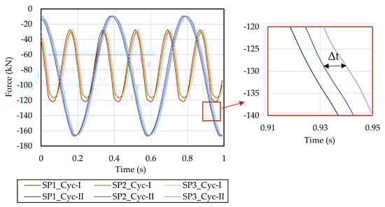 Figure 14 indicates the displacements of all rails and sleepers, for which the magnitude of the load on each actuator at 5.6 Hz, ‘Cyclic I’, oscillated between 13 kN and 58.9 kN, and for 2.5 Hz, ‘Cyclic II’, it oscillated between 5 kN and 83.4 kN, as illustrated by Esen, et al. [].