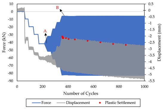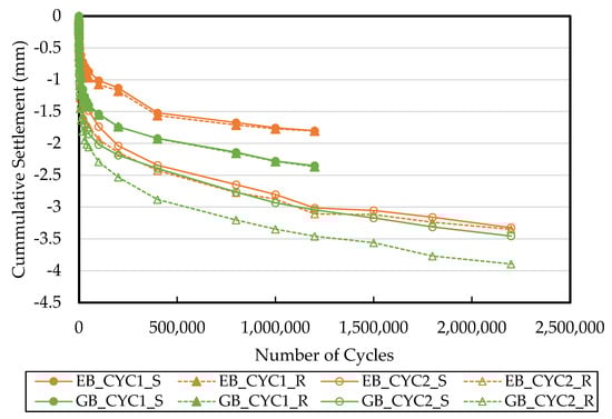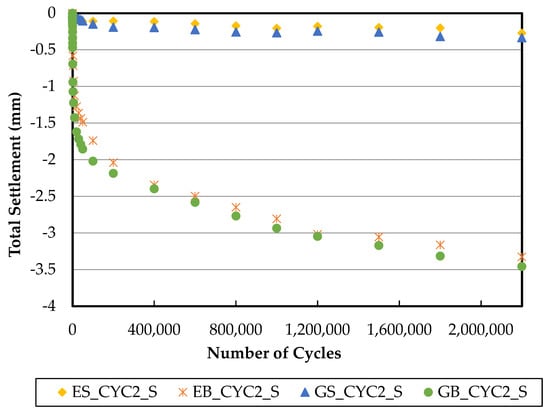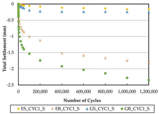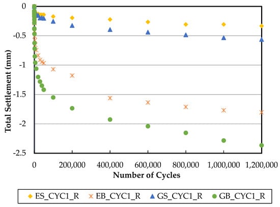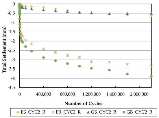 Contrary to Čebašek et al. [] and Esen et al. [], who included the initial settlement caused by the static loading as part of the cumulative settlement, this study focused on the plastic deformation solely caused by the load that reached full cycles (point B in Figure 8). The red dots in the figure were then obtained from 3.4 million cycles, which is a similar post-processing method used by Abadi et al. [,].