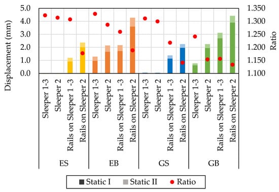 Figure 13 illustrates the displacements of the rails and sleepers under Static I and Static II loading. Sleepers 1 and 3 are indicated separately, as half of the axle load was applied on Sleeper 2 and a quarter of the load acted on Sleeper 1 and Sleeper 3. The ratio was calculated based on the displacement caused by Static II loading divided by Static I and indicated in the secondary axis of Figure 13. The force ratio, which is 17 t divided by 13 t, was 1.31. According to Hooke’s law, the displacement is linearly related to the force, so the displacement ratio, mathematically, should be 1.31 too. The ratio was about 1.31 for the conventional embankment, whereas, in the GRS-RW case, the ratio was approximately 1.20 for the slab track and 1.15 for the ballasted track. The decrease in the ratio proves that the stiffness of the GRS-RW substructure increased more sharply due to the presence of the geogrid, meaning, under certain loading, geogrids provide extra resiliency. The deformations observed in the tracks of the GRS-RW substructure under static loading were highly comparable to those of the conventional embankment. This indicates that the static stiffness of the layers under the rail of the GRS-RW substructure is similar to that of the conventional embankment, despite the fact that the conventional embankment was fully confined on all four sides while the GRS-RW was only confined on two sides. However, it must be noted that the overall stiffness of GRS-RW can still be lower than the conventional embankment.
