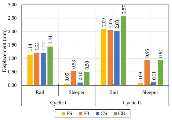 Average absolute displacements of the rails and sleepers under cyclic loading (slab in the slab track case), as illustrated by Esen, et al. [].