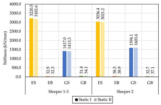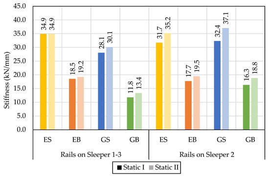 The stiffness of the track, including all layers under the rail, is shown in Figure 15 and the stiffness underneath the sleepers is shown in Figure 16. The reason for the significant difference in the stiffness is due to the presence of the rail pads for which the static stiffness was 22.5 kN/mm and the dynamic stiffness was 40 kN/mm. The stiffness of the pads was higher under heavier static loading, proving the pads deformed non-linearly. The stiffness of the track below the pads, on the other hand, showed similar stiffness values in both static loading cases, meaning the displacement was still behaving linearly. A 300 mm deep ballast box test was performed to identify the realistic stiffness and settlement characteristics by McDowell et al. [] that determined the ballast stiffness as 330 kPa/mm (24.75 kN/mm), which is in good agreement with the result of the ballasted track on the embankment presented in Figure 16, as the depth of the ballast in the current test is 400 mm.