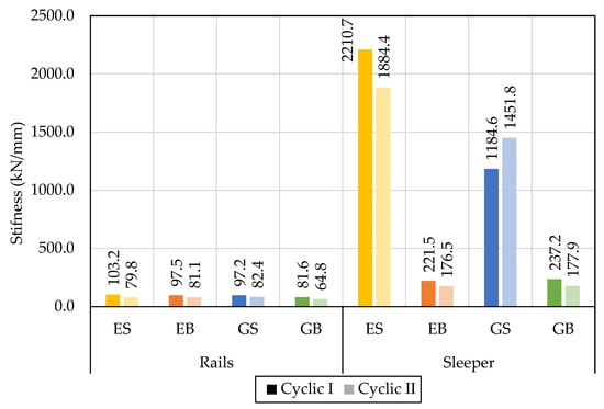 The stiffness levels under the rails and sleepers are shown in Figure 17. When the frequency of the loading decreased, the stiffness values also decreased despite the increase in the load magnitude at Cyclic II. The higher frequency at the Cyclic I tests dictated more of the dynamic behaviour of the soil, leading to higher stiffness levels. The soft rail pads dominated the overall track stiffness, however, as expected, the slab track was 10 times stiffer than the ballasted track on the conventional embankment and approximately 5 times stiffer in the GRS-RW case.