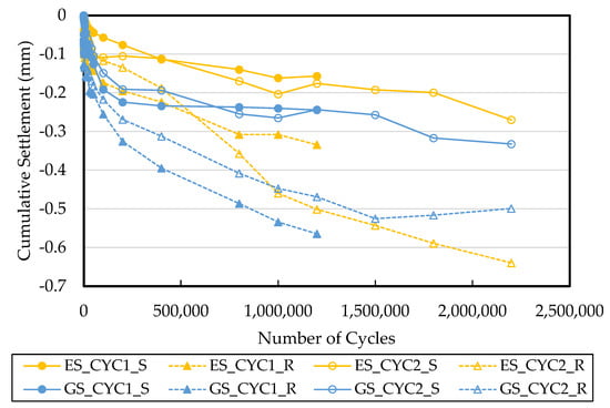 The most common parameters encountered in the settlement models, presented in Section 2, are the applied load, track stiffness, and number of cycles. As previously indicated, the deflections of the sleepers of the slab and ballasted tracks were obtained using the four LVDTs placed on sleepers 1 and 3, i.e., at the corners of the track, whereas, in the case of the rails, all six rails on sleepers 1, 2, and 3 were taken into account. Figure 18 and Figure 19 display the overall settlement of all tracks, using the same illustration method as Abadi et al. [] where dots are connected with lines. In the above-presented experimental results, the total settlement of the rails was higher than the settlement of the slab due to the plastic deformation which occurred in the rail pads, for the conventional embankment case, as shown in Figure 18. The plastic settlement of the rails under the same number of cycles was nearly double that of the slab. The same materials were used for the slab track and HBL in both substructures, so the smaller deformation was observed in the conventional embankment soil. The slab settlement in the case of ES at Cyclic I loading was nearly half of that of GS, whereas, during Cyclic II loading, the slab settlement was similar until about the 1,500,000th cycle. After that, the GRS-RW substructure reached a resilient state and the settlement levelled off at 0.52 mm, while the slab track on the conventional embankment continued to settle until 0.64 mm. Another notable result is the total settlement of the slab during Cyclic I and Cyclic II. It was similar for the 1,200,000 cycles, although the load amplitude was 1.33 times greater during Cyclic II. In conclusion, the settlement of the soil under the slab tracks was dependent on the physical soil conditions and the number of cycles.