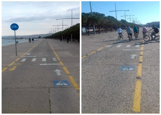 According to Hamilton-Baillie [1,2], shared spaces are characterized by two main elements: the minimization of segregation between users and the reliance on mutual respect. These two elements are applicable in the seafront area, as segregation between cyclists and pedestrians exists; however, this does not include any physical elements, and the harmonious co-existence of users heavily relies on mutual respect. Moreover, the specific area can be considered as a destination place that mostly attracts people for recreational purposes, which is an additional attribute of shared spaces. In this sense, we characterize the seafront area as a shared space, even if an indication about space allocation exists.