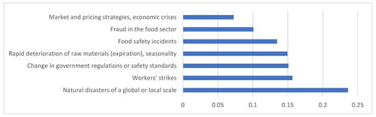 The expert survey (Figure 1) showed that the most important risk from those examined is natural disasters of a global or local scale, while the least important risk is fraud in the food sector. The rest risks are ranked as follows: market and pricing strategies and economic crises are the second most important risk for agri-food supply chain; the rapid failure of raw materials or products and their seasonality—the third most important risk; almost identically important is the risk of food safety incidents (the fourth place). Less important compared to places 2–4 are changes in government regulations or safety standards (ranked in fifth place) and the risk of strikes by workers (sixth place).