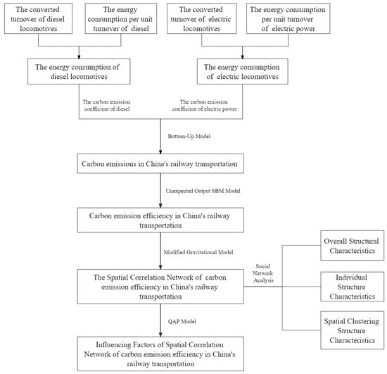 To address these gaps, we first measured the carbon emission efficiency of the railway transport industry in China. Then, we constructed a gravitational moment matrix of the spatial correlation network based on the carbon emission efficiency, and we measured and explored three aspects of the structural characteristics of the spatial correlation network, including the overall, individual and spatial clustering aspects. Finally, we used “relationship” data to analyze factors influencing the spatial association network. Additionally, the research process figure is shown in Figure 1.