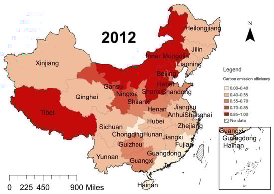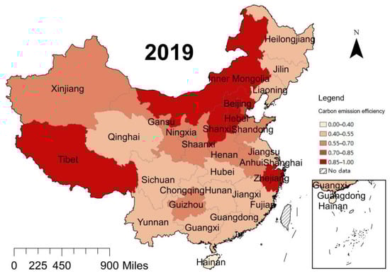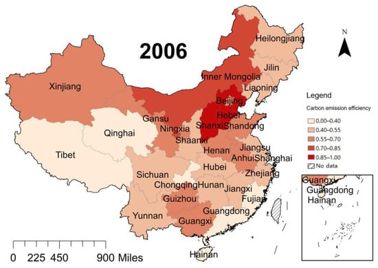 The data of railway carbon emission efficiency of 31 provinces in China from 2006 to 2019 are shown in Table 4. Additionally, we divided the carbon emission efficiency for the 31 regions into five levels, taking 2006, 2012, and 2019 as examples to draw the spatial distribution map of carbon emission efficiency in China’s railway transportation (Figure 2, Figure 3 and Figure 4). The higher the carbon emission efficiency, the darker the corresponding color.