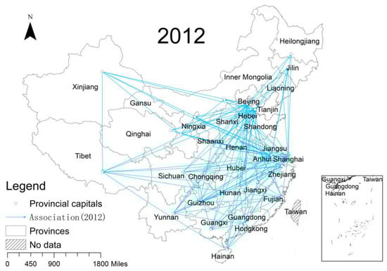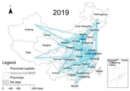 To study the individual structural characteristics, we used three indicators, namely, degree centrality, proximity centrality, and intermediary centrality. The detailed equations for each indicator are given by Liu [51]. Degree centrality represents the connectivity between a node and other nodes in the association network. A high degree centrality indicates a large number of direct links between two provinces. Betweenness centrality reflects the degree of control that a node has over other nodes. Betweenness centrality is an indicator of node importance based on the number of shortest paths passing through the node. A node with high betweenness centrality plays the role of an “intermediary” and has great control over information and resources. Proximity centrality indicates the independence of a node. High proximity centrality indicates shorter direct distances between a node and other nodes. Such a node would have greater access to information channels and be less easily controlled by other nodes.