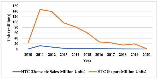 HTC smartphones domestic sales and exports 2010–2020. Source: [].