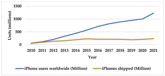 At first, cell phones were luxurious products only accessible to the rich. They did not meet immediate needs, and the customers did not feel their absence. However, over a short period, especially after the introduction of smartphones, cell phones became an indispensable part of everybody’s daily life. Figure 1 illustrates HTC smartphone domestic sales and exports in 2010–2020 and Figure 2 depicts iPhone users and iPhones shipped worldwide (2010–2021) [].