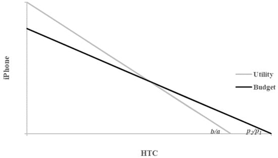 Given the linear structure of the utility function and the budget constraint for perfect substitutes, the argument is better depicted in a graphic manner as follows. Figure 3 provides such a depiction. It is a two-dimensional chart for Equations (1) and (2). The intersection of the black line, which is the budget constraint, and the grey line, which is the indifference curve, for the two brands for different prices of iPhone provides the respective points on Equation (3). It should be noted that since the two graphs are linear, the point of maximum utility for any given budget constraint would be either {0,HTC} or {iPhone,0}.