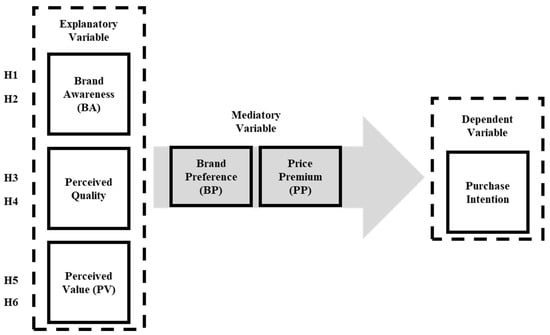 Casalegno et al. [] studied the antecedents of green and sustainable purchase behavior. Latip et al. [] discovered that an individual’s attitude, perceived social pressure, and perceived autonomy all affected their intention to make a sustainable purchase. In this study, the intrinsic value of the brands based on which the consumer makes their choice is measured as brand awareness, perceived quality and perceived prestige value. Furthermore, the nominal value of each brand is measured as brand preference and price premium. Finally, the continued demand for each brand is measured as sustainable purchase intention. Based on the existing body of literature, this section discusses the relation between said factors to infer this study’s hypotheses.