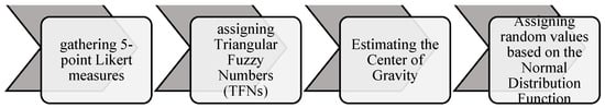 The data gathered via the questionnaire provided crisp and discrete values for each construct. The data were put through a fuzzification process to increase the results’ efficiency and accuracy. It was first introduced into the literature in 1965 by Zadeh. Since then, the concept and the process have evolved and are still evolving considerably. In this study, following the work of Chen and Hsieh [], the 5-point Likert scale went through several fuzzification and defuzzification processes. Figure 6 depicts the said process.