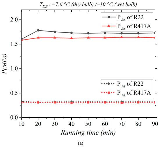 Figure 4 shows the inspiratory (Pins) and discharging pressure (Pdis) of the compressor with R22 and R417A working fluids under two operating conditions. It is shown that the inspiratory pressures of R22 and R417A are similar. However, the compressor discharging pressure of the ASHP with R417A under the design and nominal conditions is, respectively, 11.0% and 9.8% lower than that of R22.