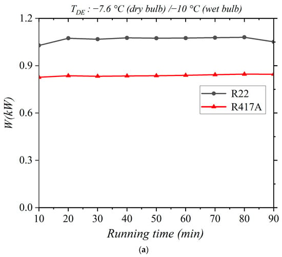 Figure 6 shows the ASHP power and the operating time with the two refrigerants under design and nominal conditions. As shown in the Figure, the power of the ASHP filled with R22 is higher than that in the case of R417A. For R22, the average power under the design condition is 1.07 kW, while the average power of the ASHP with R417A is 0.84 kW, around 21.5% lower. Under nominal conditions, the average power of the ASHP with R22 is 1.05 kW, while the average compressor power of the ASHP with R417A is 21.0% lower at 0.82 kW.