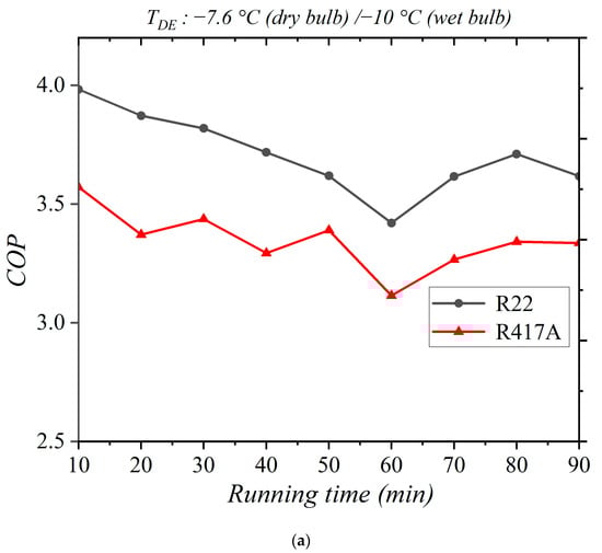 Furthermore, to compare the energy efficiencies of using the two refrigerants, the heating capacity is another key parameter to consider. Figure 7 shows the heating capacity of the ASHP and the operating time under the two working conditions. Under the design condition, the average heating capacity with R22 is 4.0 kW, while an average heating capacity of 2.9 kW was obtained using R417A, which is 26% lower. Under the nominal condition, an average heating capacity of 4.0 kW was obtained using R22, and the average heating capacity of the ASHP filled with R417A is 2.7 kW, which is 31% lower. This could be because R417A is a three-component non-azeotropic mixture with temperature slippage. This affects the heat transfer performance of R417A, especially the bubble escape resistance.