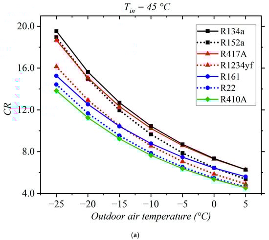 (a) Compression ratio (CR) of the ASHP with different refrigerants under different outdoor air temperatures; (b) Compression ratio (CR) of the ASHP with different refrigerants under different supply water temperatures.