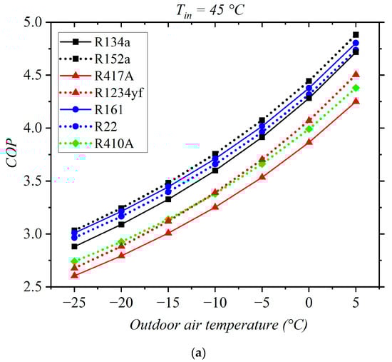Figure 10 displays the DT of ASHP under different outdoor air and supply water temperatures. The DT of the R22 system is obviously higher than that of other systems. The R1234yf system has the lowest DT, followed by the R417A system. As the supply water temperature increases from 30 °C to 55 °C, at a fixed outdoor air temperature of −10 °C, the average DT of the R22 system is on average 38.7%, 26.2%, 25.3%, 9.3%, 4.9% and 4.1% higher than that of the R1234yf, R417A, R134a, R152a, R161, and R410A systems, respectively. As the outdoor air temperature rises from −25 °C to 5 °C, at a fixed supply water temperature of 45 °C, the average DT of the R22 system is on average 38%, 26%, 25%, 9.3%, 5.1%, and 3.9% higher than that of the R1234yf, R417A, R134a, R152a, R161, and R410A systems, respectively. Overall, an ASHP with a low DT could prolong the service life of the lubricating oil, reduce unit loss, and improve operation stability. Thus, compared to the R22 system, the refrigerants R1234yf, R417A, R134a, R152a, R161, and R410A can effectively prevent lubricating oil decomposition and deterioration.