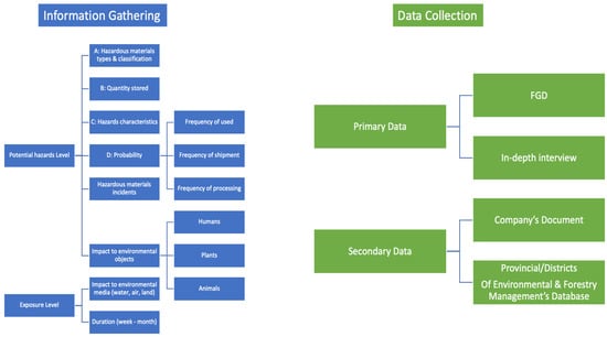 Information gathering, data collection and methodological framework are described in Figure 1. Figure 1 explains the information gathered, the data collected and the methodological framework of this study. The process involved information gathering for potential hazard levels such as hazardous material types and classification, quantity stored, hazards characteristics, hazard probability, possible hazardous materials incidents, and impact on environmental objects; for exposure level such as the impact on environmental media and its duration. In addition, data collection was carried out by acquiring both primary data (from focus group discussion and in-dept interviews) and secondary data (from companies’ documents).