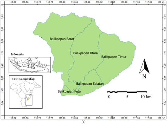 This study was carried out in the city of Balikpapan, East Kalimantan province (see Figure 1), and this city consists of five sub-districts including Balikpapan Kota, Balikpapan Barat, Balikpapan Utara, Balikpapan Timur and Balikpapan Selatan. Balikpapan’s geo coordinates are 116.7290°–117.0215° east longitude and 1.0421°–1.2851° south latitude. Balikpapan, covering 503.3 km2, is largely hilly (85%), with only a few flat sections (15%) around the shore and bordering the steep hills. The hills are just about 100 m higher than the lowlands below. Balikpapan’s elevation ranges from 0 to 80 m above sea level. The city proper is situated on the eastern side of Balikpapan bay. The majority of the soil of Balikpapan is yellow-reddish podzolic soil with alluvial and quartz sand, making it prone to erosion. Due to the lack of precipitation, Balikpapan has a tropical rainforest climate (Af). The city receives 2400 mm of rain per year on average. Throughout the year, the weather in Balikpapan is quite consistent. The city does not have noticeably wetter or drier seasons, and the typical temperatures are practically comparable throughout the year, hovering around 26–27 °C.