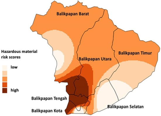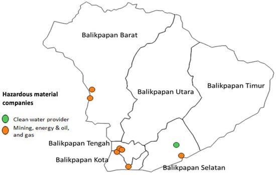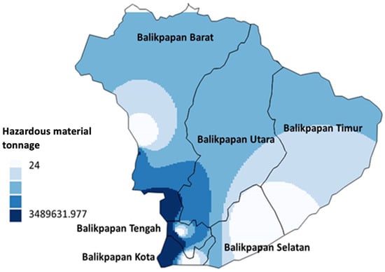 One of the industrial areas in Indonesia is Balikpapan, in the province of Kalimantan, where oil and gas exploration were first established. In its development, industrial activities in Balikpapan City have grown, both industrial activities that support the oil processing industry and other industrial activities such as building material industries, mining, construction industries and others [23]. Balikpapan City has a population of 688,318 people. Balikpapan City occupies a hilly area with a slight slope around the river and the coast. Natural hazards that occurred in Balikpapan City included floods and landslides. There were 83 incidents of flooding recorded throughout 2020, and 38 incidents of landslides occurred. The installation of an initial detection tool for an early warning system such as a buoy for the new tsunami natural hazard is planned in the Balikpapan–West Sulawesi segment [24]. The total amount of hazardous and toxic materials in Balikpapan City as of 2021 was about 10 tons, with materials with flammable properties and extremely flammable amounting to one to four tons. Statistically, the total of hazardous and toxic waste in the City of Balikpapan as of 2021 was approximately 77 tons. In the year 2018, Balikpapan City experienced an industrial and environmental disaster, due to a large fire and oil spill. This industrial and environmental disaster caused the death of five fishermen, large public health problems and damage to wildlife and ecosystems [25,26,27].