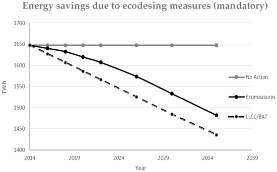 The next charts, based on Annex E of the European Commission’s working document [24], represent the energy savings that will occur if the proposed policies’ requirements are implemented (Figure 2 and Figure 3).