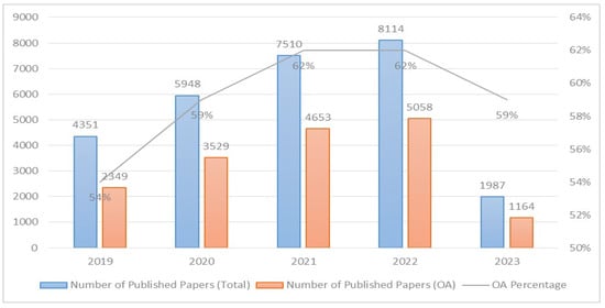 Trend in published articles in the subject area of Sustainable Development Goals. Source: Web of Science (accessed on 19 April 2023). Note: Conducted Keyword Research in WoS: Topic (SDGs or Sustainable Development Goals or SDG). Time frame: last five years 2019–2023; Total N = 27,910; OA N = 16,753. OA = open access.