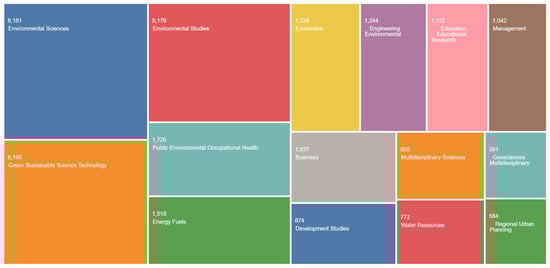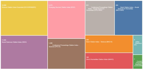 The topic of the SDGs is very well debated in the literature and has a decidedly growing trend—Figure 1. In the past four and a half years, about 27,910 papers have been noted, where the keywords used in the Web of Science (WoS) were: (i) SDGs; (ii) Sustainable Development Goals; and (iii) SDG. The open access value shows that this option now represents the majority among published papers, even exceeding three-fifths. The 2023 data are close to that figure with 59%. We proceed to analyze the WoS categories (Figure 2), in which that related to Environmental Sciences stands out (29%) followed by Green Sustainable Science Technology (22%) and Environmental Studies (19%). The others turn out to be more detached, starting with Public Environmental Occupational Health (6%). Below, the geographical distribution of the published papers is analyzed (Figure 3), with two countries excelling over all others with about 15%: the USA (4154) and China (4138). It should be highlighted that the top ten countries encompass about 83% of the total value: United Kingdom (3115), India (2091), Australia (1963), Spain (1931), Germany (1675), Italy (1600), Canada (1315) and South Africa (1221). The trend in papers published by the WoS Index (Figure 4) has the Science Citation Index Expanded (58%) leading, followed by the Social Sciences Citation Index (42%). The trend in papers published by the WoS Index (Figure 4) sees the Science Citation Index Expanded excel (58%), followed by the Social Sciences Citation Index (42%). Finally, the last analysis proposes a map of the SDGs receiving the most attention (Figure 5). The results show that SDG 3 (1244) prevails followed by SDG 2 (1212) and SDG 1 (1201). SDG 14 (353) and SDG 16 (314) complete the ranking.