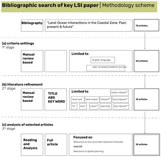 The systematic literature review (Figure 1) was conducted with the aim of finding relevant studies on Land–Sea Interaction. The only search criterion was that all articles should be scientific; therefore, an open-source academic database was used (Scopus). The methodology was structured according to a four-stage review process: (a) criteria settings, (b) literature search, (c) literature refinement, and (d) analysis of selected articles.