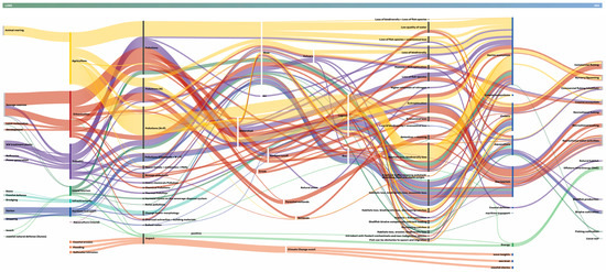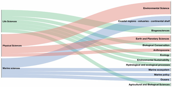 The Sankey Matic is an online open-source tool that depicts information flows, where the width of each flow pictured is based on the amount of input. Sankey diagrams are very effective at showing particular kinds of complex information, for example, flows of energy from source to destination and goods from place to place. Land–Sea Interactions flows in the diagram are built on strings based on a pair of nodes (A to B, from B to C, and so on). Since the tool works in pairs of nodes, all the Land–Sea Interactions collected through the literature reviews were systematized into an Excel file. The logic underlying the categorization process was based on the structure flow of Land–Sea Interactions detected from the literature review analysis.