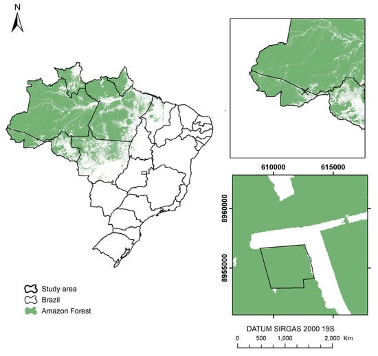 The study was carried out at Antimary Farm I and II, located in the Southwestern Amazon, in the municipality of Porto Acre, Acre, Brazil (Figure 1). The area under sustainable management comprises 1253.02 ha. The region’s vegetation is classified as “terra firme”—a forest with solid ground—and wetland rainforest []. The climate of the region is of the Am type, according to the Köppen classification []. The study area presents two types of soil, Red Argisol and Dystrophic Red Yellow Latosol []. The topography is predominantly flat, with a slope of around 5%. The altimetry varies between 220 and 300 m above sea level.