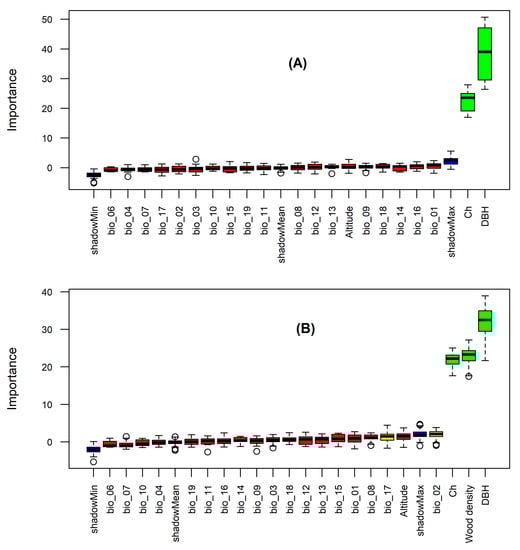 The Boruta algorithm [] was applied to select the best set of predictor variables to estimate volume and biomass. Boruta is a feature selection algorithm that was specifically designed to work with random forest models. The algorithm identifies the most relevant variables in a dataset by comparing the importance of each variable to that of randomly generated shadow variables. The shadow variables are created by permuting the values of each variable so that they are no longer associated with the response variable. The importance of each variable is then assessed by comparing the accuracy of a random forest model trained with the original variables to that of a model trained with the shadow variables. This algorithm iteratively removes the resources that are proven by a statistical test to be less relevant than random probes []. The Boruta R Software Package was used.