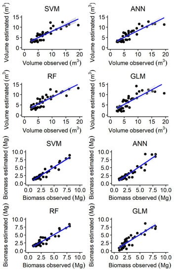 Figure 3 shows the relationship between the observed and predicted values of volume and biomass for each evaluated technique. The blue line represents the tendency of the data. In general, the evaluated models showed a satisfactory generalization power, indicated by similar precision results between the observed and estimated data in the validation for all variables studied (Figure 3). Pearson’s correlation coefficient (ryŷ) between the estimated and observed volume and biomass data was greater than 0.85 in all the machine learning models applied.