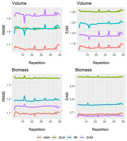 The means of RMSE and MAE varied over the repetitions for each technique. The RMSE and MAE averages of ANN and GLM showed the lowest values when estimating the volume of trees (Figure 3). ANN and RF showed the lowest RMSE and MAE over 50 repetitions in the cross-validation when estimating the biomass (Figure 4). SVM showed greater instability in the values of RMSE and MAE of the cross-validation and the highest values of RMSE and MAE for all variables evaluated in the present study.