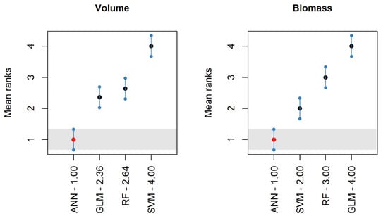 The Friedman test with the means of cross-validation RMSE showed that the predictions of the volume and biomass of commercial trees in the Amazon differed between the techniques (p < 0.05). Thus, the hypothesis that at least one average of one of the techniques differs from the others was accepted. The Nemenyi test indicated that the difference between the GLM model and the other techniques was greater than the calculated critical difference (CD) when estimating the volume of the trees. The calculated critical difference (CD) of the ANN was greater than the other machine learning techniques evaluated when estimating the biomass (Figure 5).