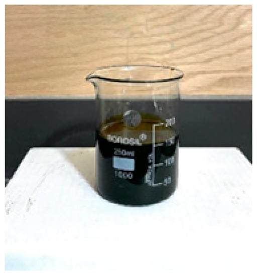 Two long-term and short-term aging processes were performed to age the samples. The short-term aging process proceeded artificially at 163 °C for 85 min. This was followed by a long-term aging treatment, which was performed under 2 bars of pressure at 100 °C for 20 h in the PAV. Once the aging treatments were completed, the tests mentioned in the study design flowchart were conducted to investigate the impact of modification via SIS–PO. The appearance of the PO is depicted in Figure 2.
