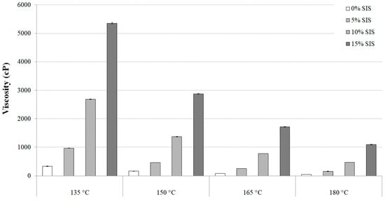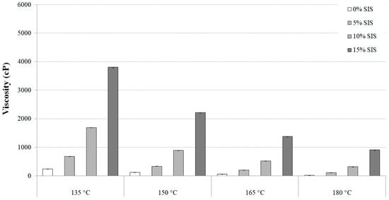 Effect of SIS content on the PG 64-22 binder’s viscosity modified with 12% processed oil.